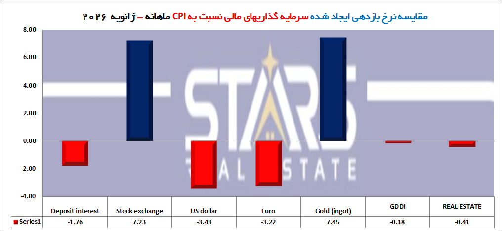 نرخ بازده ماهانه داراییها نسبت به CPI (ژانویه ۲۰۲۶): در این ماه طلا با ۷.۴۵% و بورس با ۷.۲۳% در صدر بازدهیهای ماهانه قرار گرفتند. مسکن بازدهی منفی ۰.۴۱% را ثبت کرد در حالی که دلار با منفی ۳.۴۳% ضعیفترین عملکرد را در برابر تورم داشت.